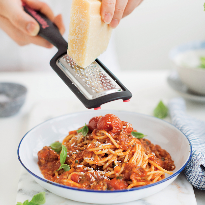 Deze kleine rasp is bedoeld om kleine en middelgrote hoeveelheden te raspen. En ze heeft voetjes, dus kun je zelf kiezen of je ze 'vrij uit de hand' of stabiel op de voetjes gebruikt.